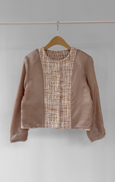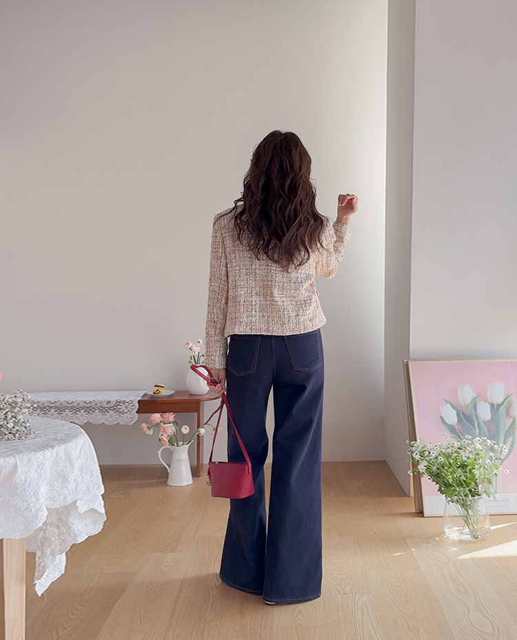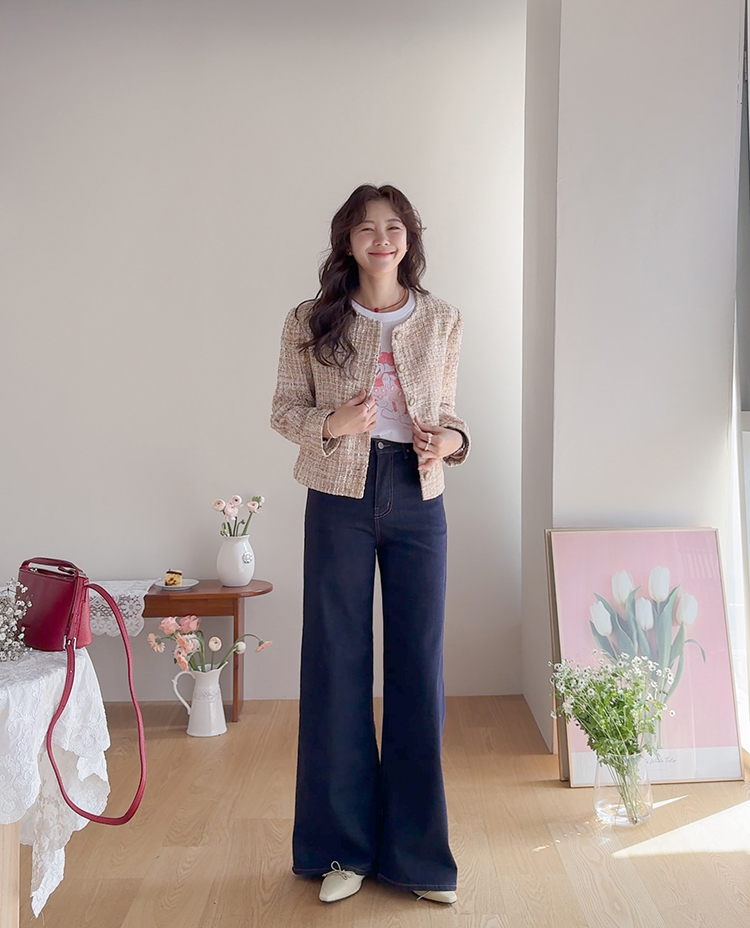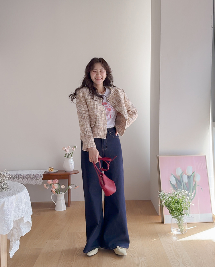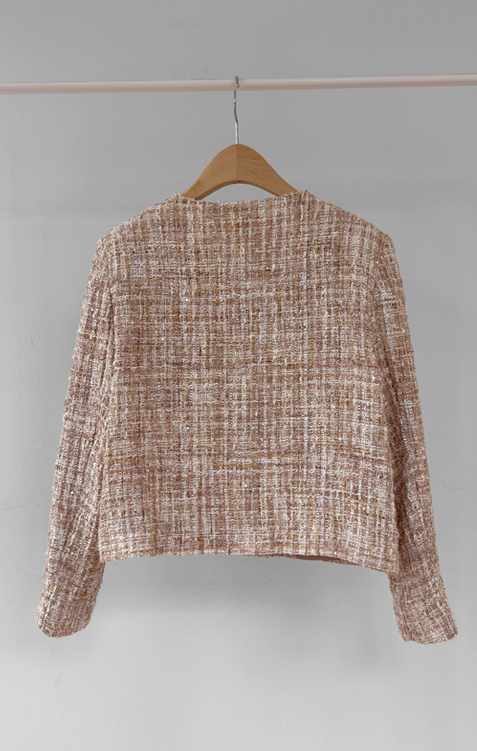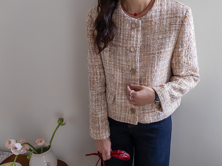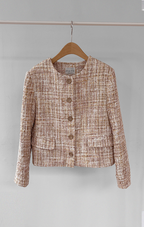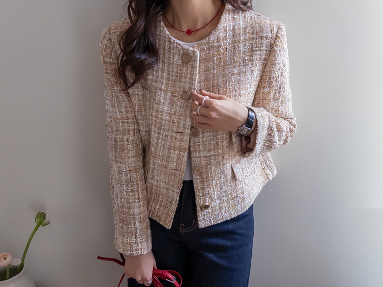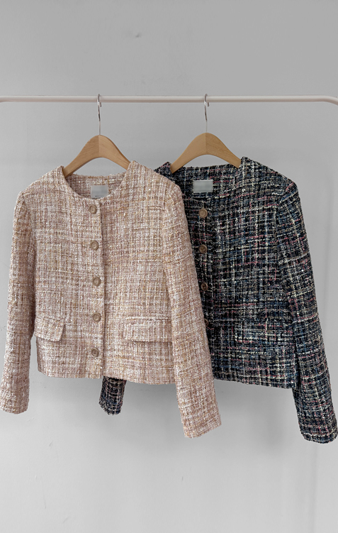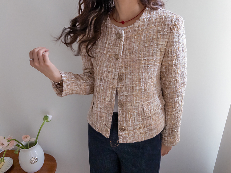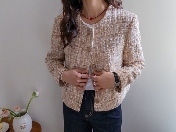 고급스러운 분위기가 돋보이는 트위드 자켓 소개드려요 ^^ 여러 컬러의 실과 다양한 굵기의 원사가 믹스된 입체적인 트위드 조직감이 특징으로 단조롭지 않고 풍부한 텍스처를 느낄 수 있는 아이템이에요. 원단 사이사이에 은은한 실버 스팽글과 메탈 원사가 더해져 과하지 않으면서도 자연스럽게 반짝이며 고급스러운 무드를 완성해줍니다. 버튼은 디테일이 살아있는 엠보 메탈 버튼을 사용해 자켓의 완성도를 한층 더 높여주고요, 전체적으로 깔끔하게 떨어지는 핏과 앞판 포켓 디테일이 더해져 단정하면서도 세련된 스타일로 연출하기 좋습니다. 데님, 스커트, 원피스와 함께 데일리부터 격식 있는 자리까지 다양하게 활용하기 좋은 자켓이에요 ♡