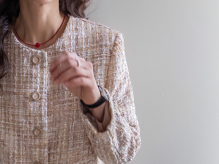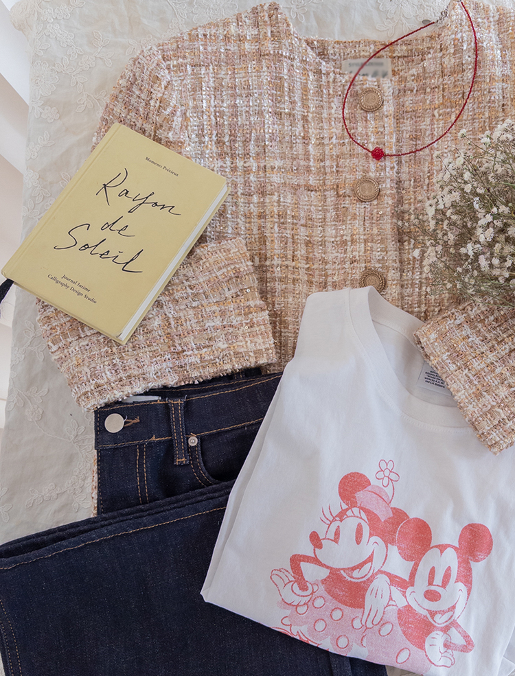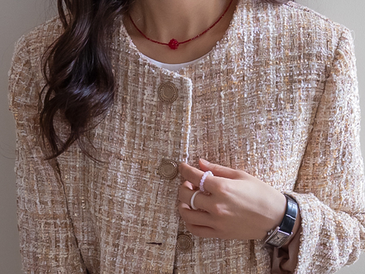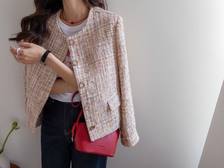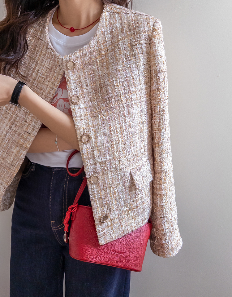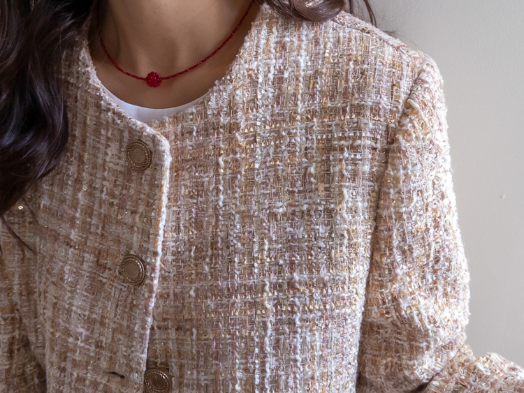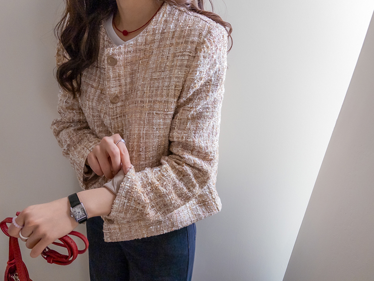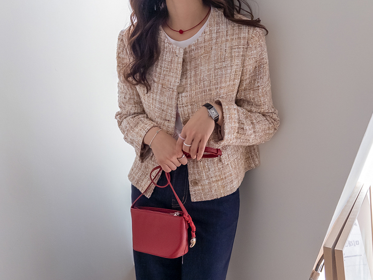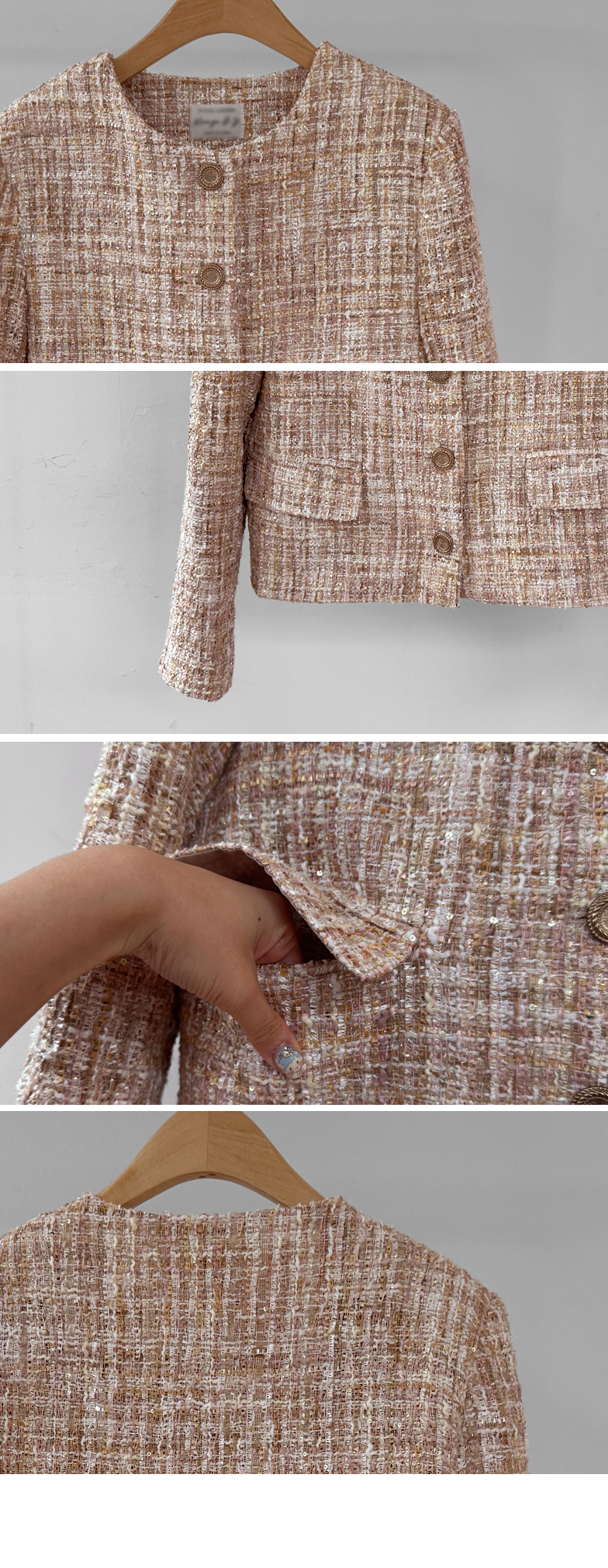 고급스러운 분위기가 돋보이는 트위드 자켓 소개드려요 ^^ 여러 컬러의 실과 다양한 굵기의 원사가 믹스된 입체적인 트위드 조직감이 특징으로 단조롭지 않고 풍부한 텍스처를 느낄 수 있는 아이템이에요. 원단 사이사이에 은은한 실버 스팽글과 메탈 원사가 더해져 과하지 않으면서도 자연스럽게 반짝이며 고급스러운 무드를 완성해줍니다. 버튼은 디테일이 살아있는 엠보 메탈 버튼을 사용해 자켓의 완성도를 한층 더 높여주고요, 전체적으로 깔끔하게 떨어지는 핏과 앞판 포켓 디테일이 더해져 단정하면서도 세련된 스타일로 연출하기 좋습니다. 데님, 스커트, 원피스와 함께 데일리부터 격식 있는 자리까지 다양하게 활용하기 좋은 자켓이에요 ♡