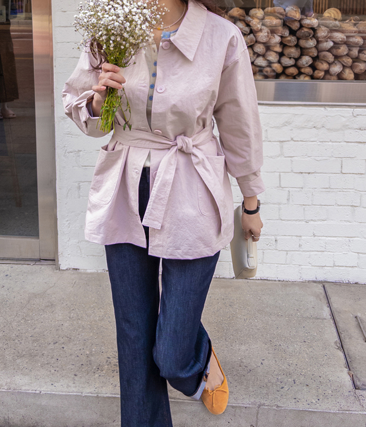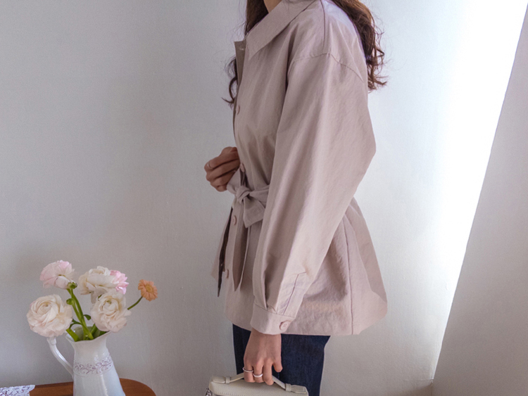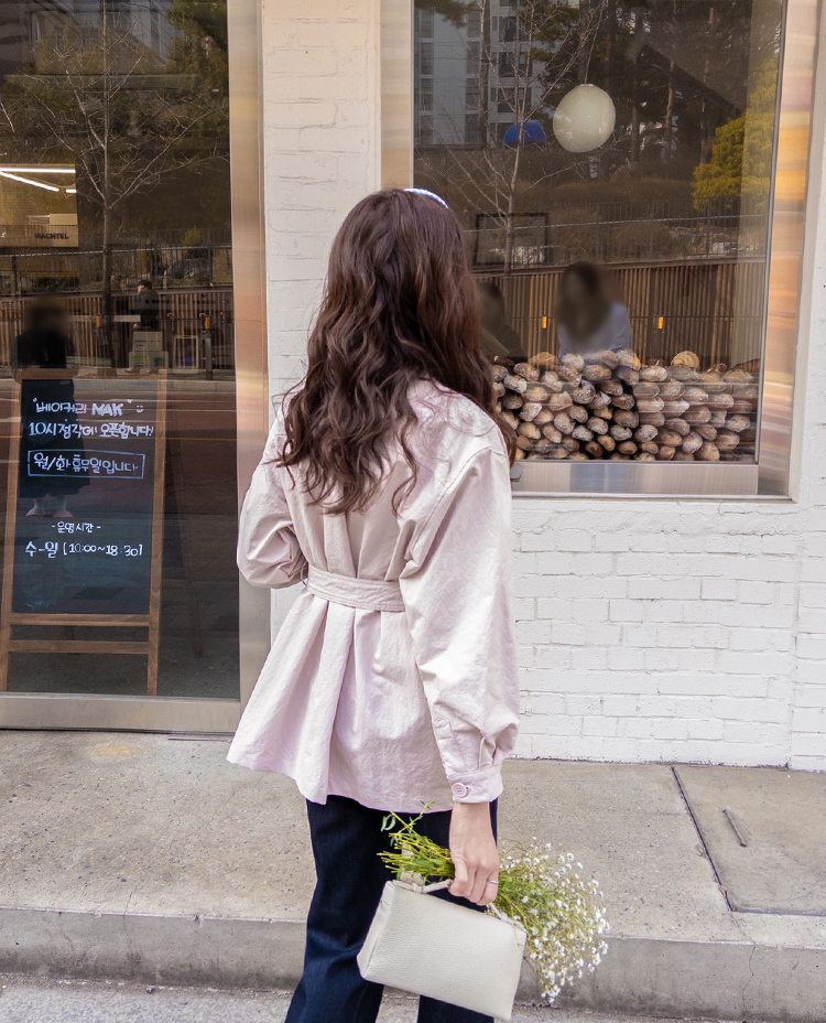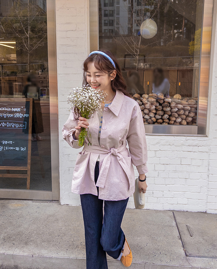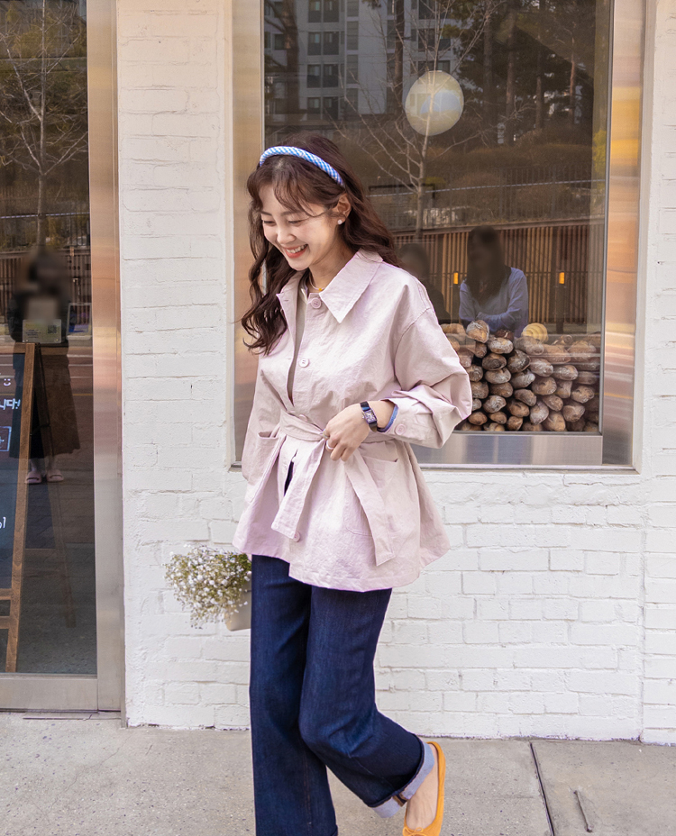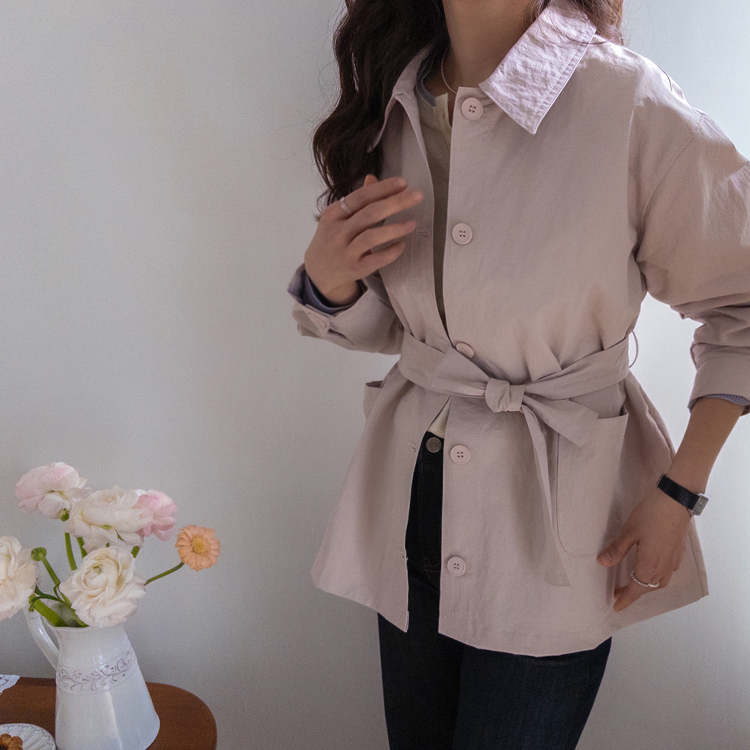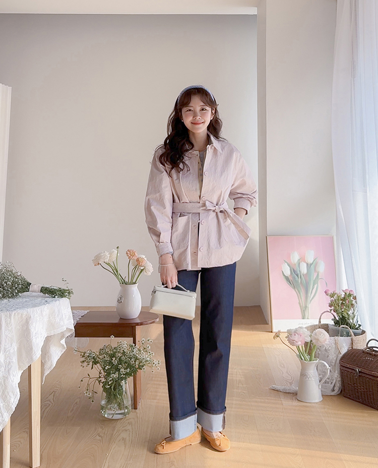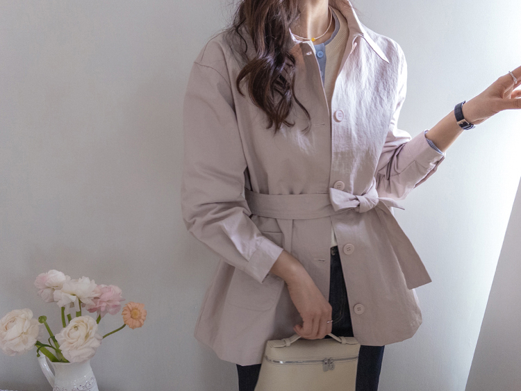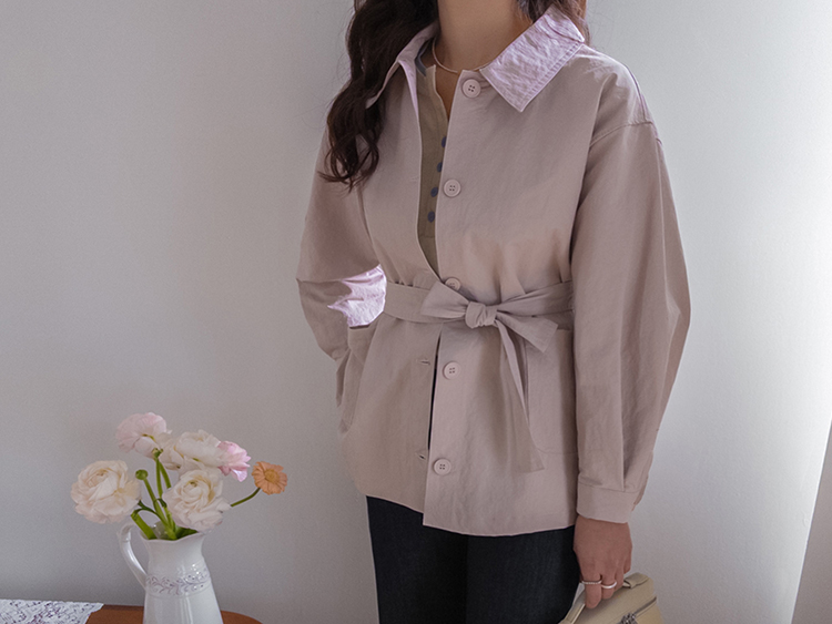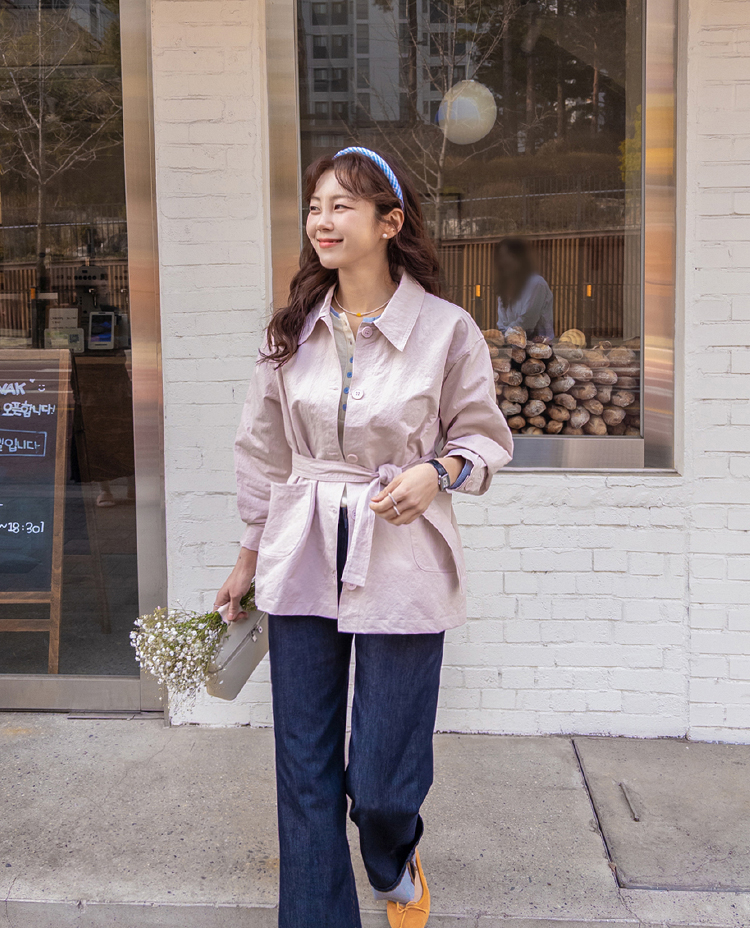 캐주얼하면서도 여성스럽게 연출하기 좋은 싱글 자켓 소개드려요 ^^ 심플한 싱글 버튼 여밈 디자인에 여유 있는 핏으로 떨어져 가볍게 걸치기 좋은 데일리 아우터예요. 앞판에는 아웃포켓 디테일을 더해 워크자켓처럼 캐주얼한 분위기도 느껴지고 벨트를 풀어 자연스럽게 떨어뜨리면 편안한 무드로 스타일링할 수 있어요. 허리 벨트를 묶어 연출하면 허리는 잘록하게 잡아주면서 위아래로 자연스러운 볼륨이 생겨 여성스러운 실루엣이 멋스럽게 완성됩니다. 벨트를 풀어 늘어뜨리면 뒤쪽에 은은한 훌이 생겨 또 다른 분위기로 연출이 가능하고요, 소매는 손목뼈 정도까지 오는 9부 기장으로 가볍고 세련된 느낌을 더해줍니다. 가볍고 드라이한 터치감의 소재로 간절기에 부담 없이 걸치기 좋고 데님이나 슬랙스와 함께 데일리룩으로 활용하기 좋은 자켓이에요 ♡