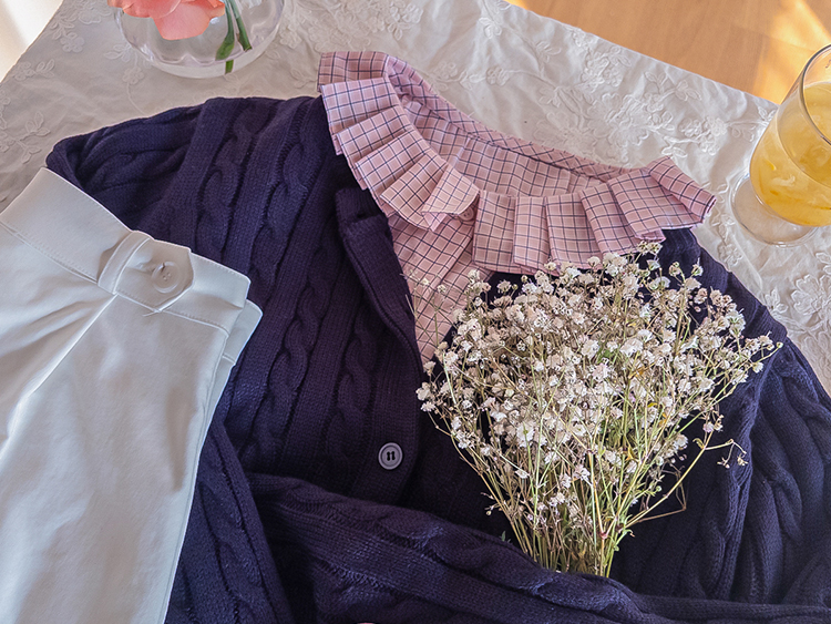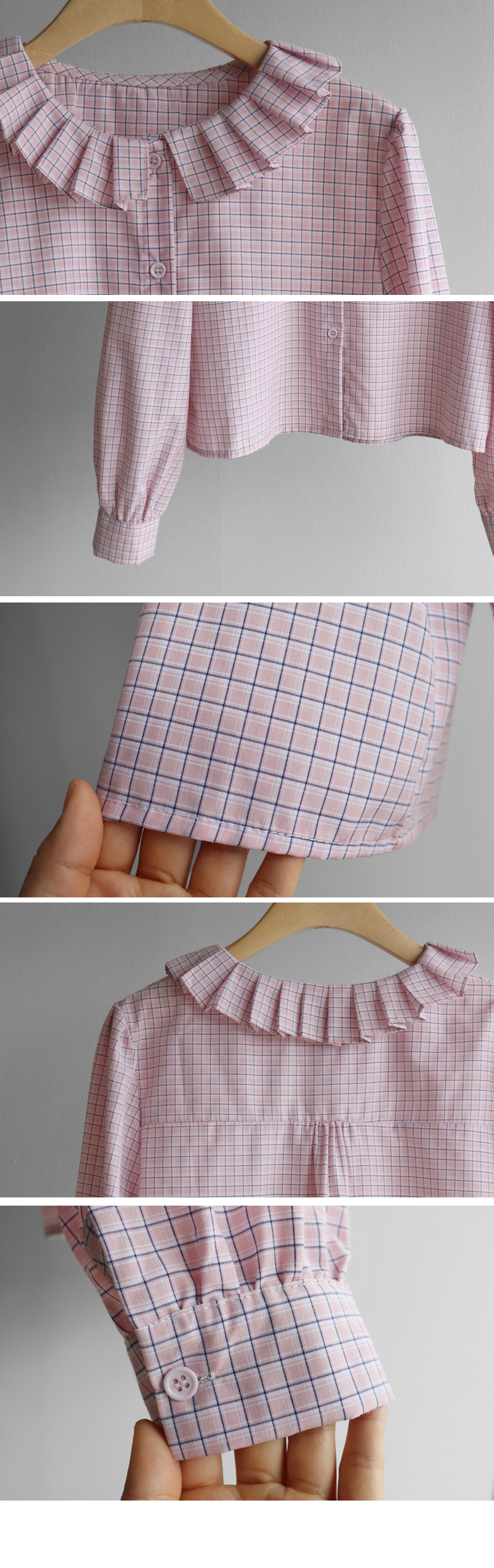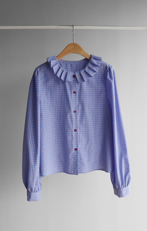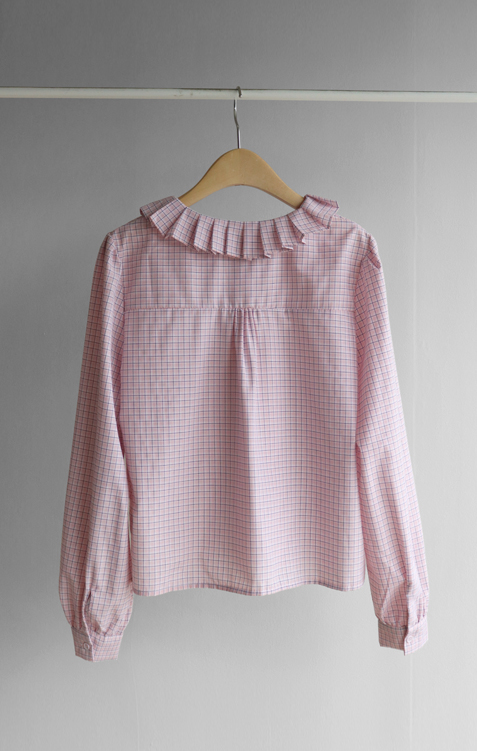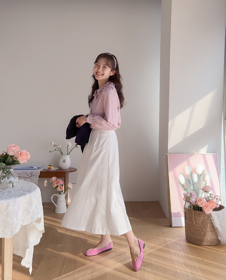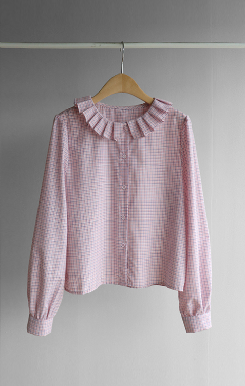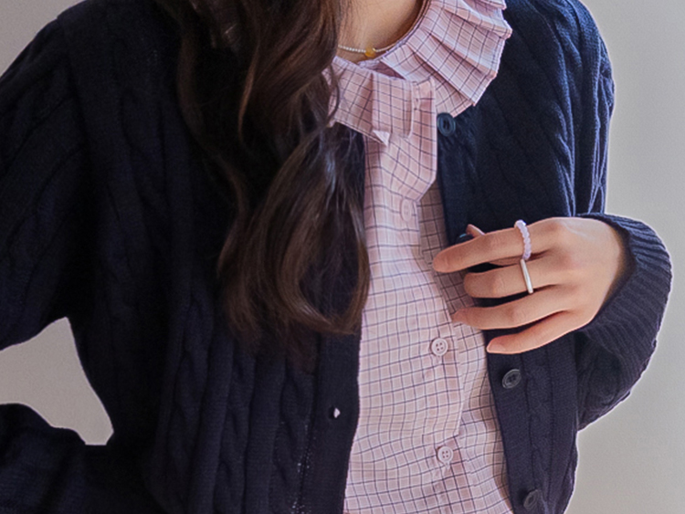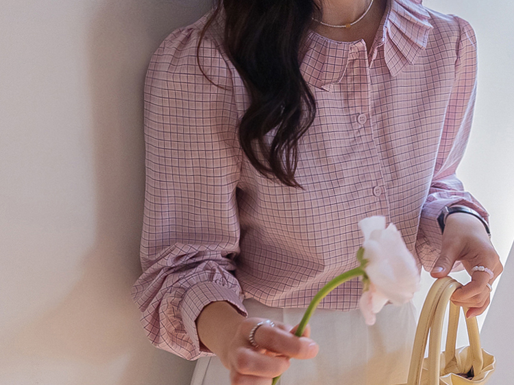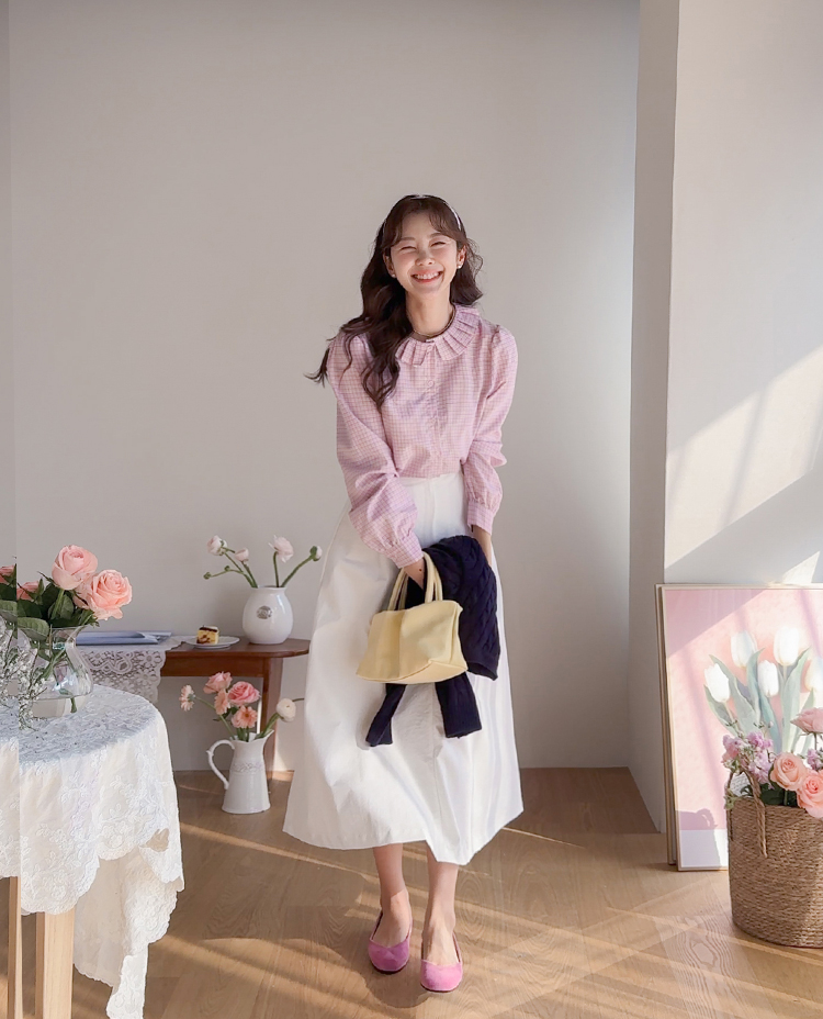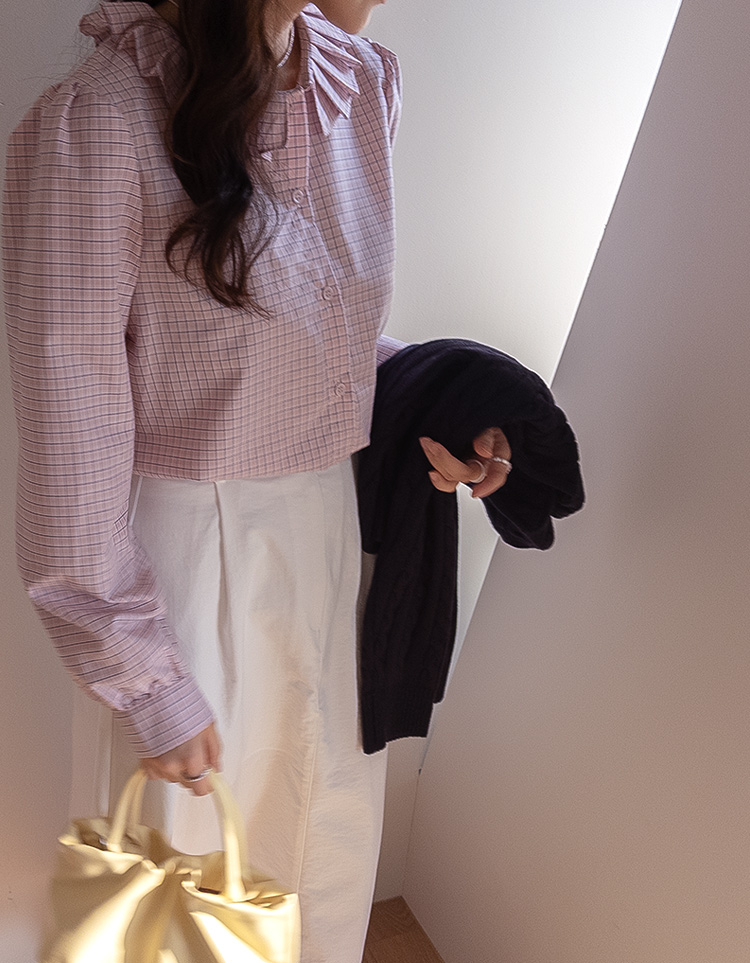 은은한 디테일이 돋보이는 체크 블라우스 소개드려요 ^^ 전체적으로 잔잔한 체크 패턴이 더해져 과하지 않으면서도 부드럽고 여성스러운 분위기를 연출해주고요, 넥라인을 따라 둘러진 플리츠 러플 카라 디테일이 얼굴선을 화사하게 살려주면서 사랑스러운 포인트가 되어줍니다. 소매는 자연스럽게 볼륨이 잡히는 핏으로 여리여리한 실루엣을 만들어주고 단정한 버튼 여밈 디자인으로 깔끔하게 착용하기 좋아요. 스커트, 데님, 슬랙스와 함께 다양한 스타일링이 가능해 데일리하면서도 포인트 주기 좋은 블라우스로 추천드릴게요 ♥