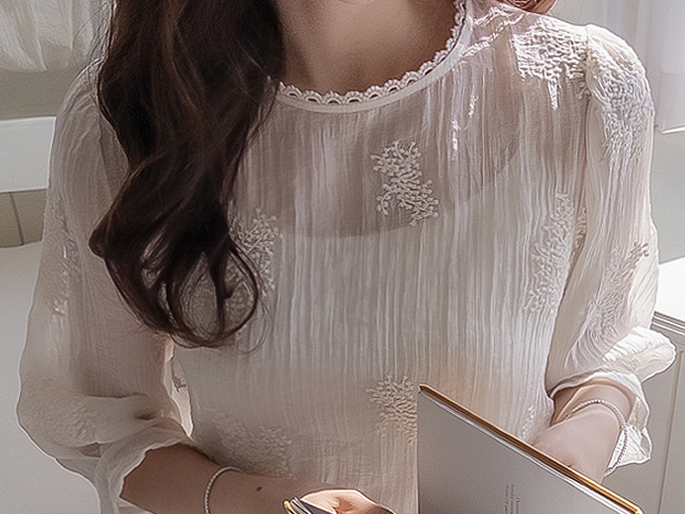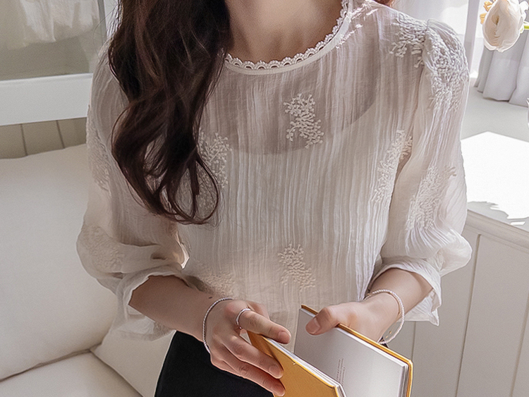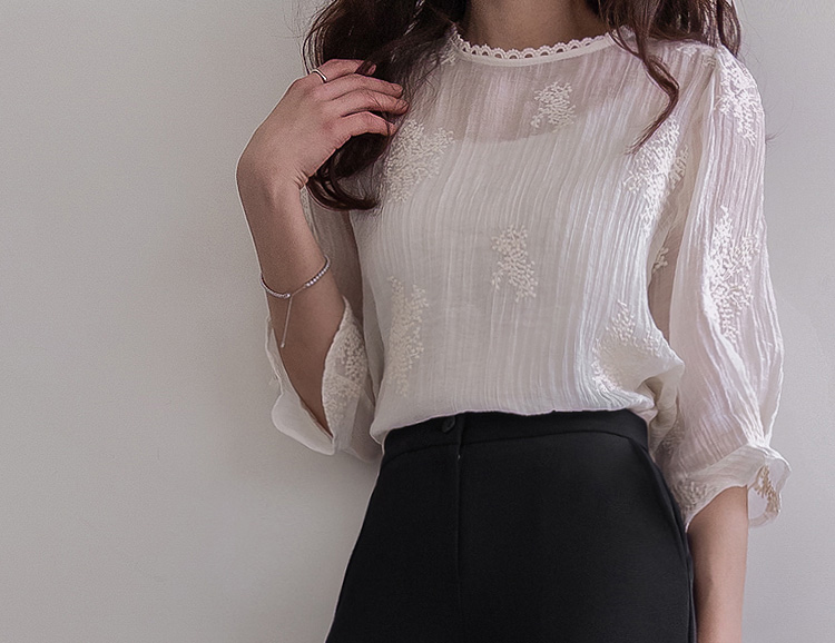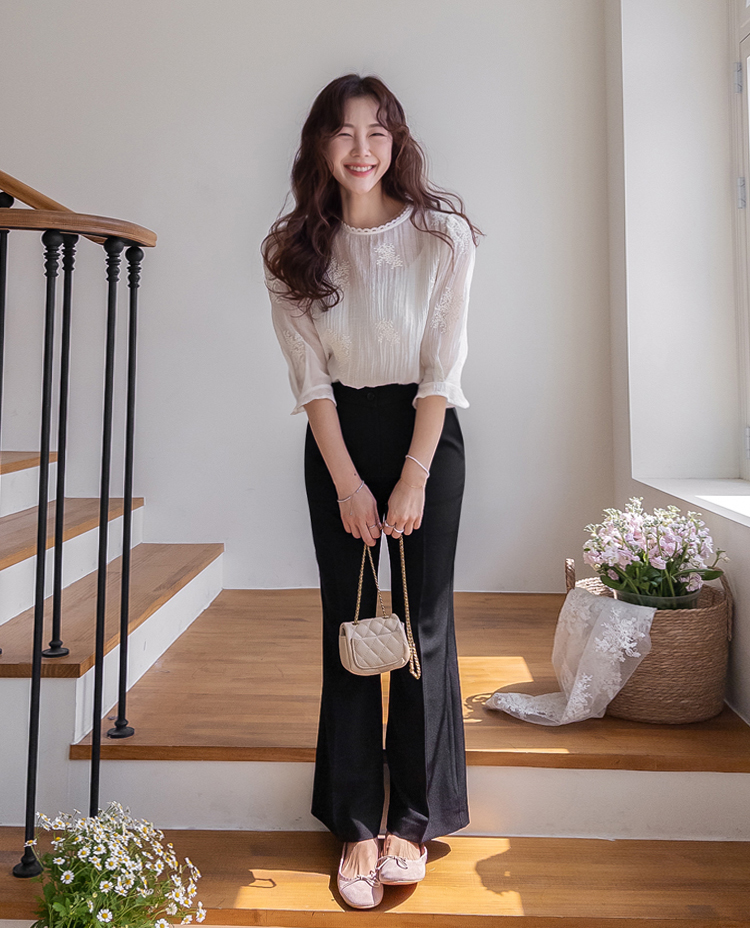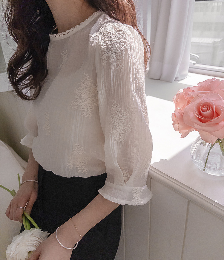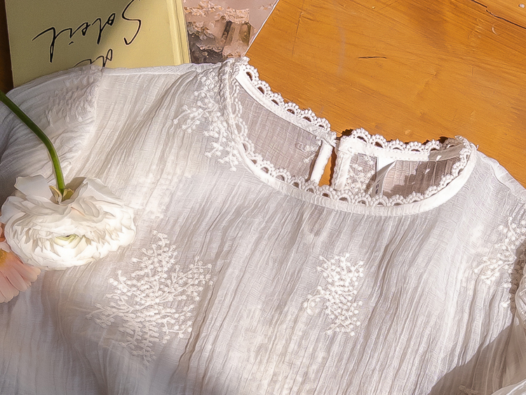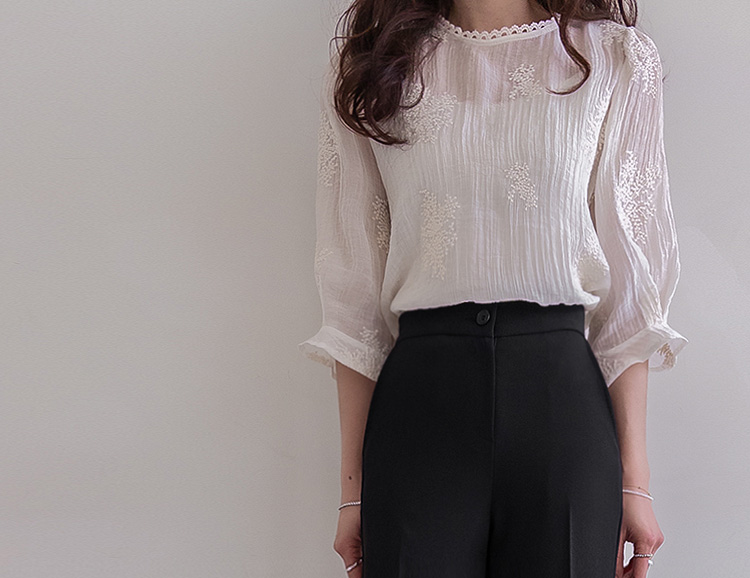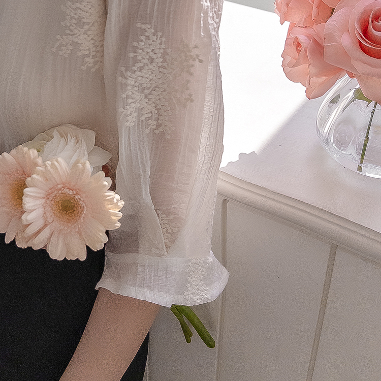 내추럴한 감성이 물씬 느껴지는 자수 블라우스 소개해드려요 :) 잔잔한 링클감이 느껴지는 코튼 원단에 은은하게 들어간 플라워 자수 디테일이 더해져 과하지 않으면서도 포인트가 되어주는 아이에요~ 가볍고 통기성 좋은 소재로 지금부터 한여름까지도 쭉 착용 가능하구요, 피부에 닿는 터치감도 부드러워 데일리로 즐기기 좋아요ㅎㅎ 넥라인에는 섬세한 레이스 마감이 더해져 얼굴선을 더욱 여리여리하게 만들어주고, 뒷부분 버튼 클로징으로 간편한 탈착까지 도와드려요! 소매는 살짝 퍼지는 봉긋한 핏으로 팔라인을 자연스럽게 커버해주면서 여성스러운 실루엣을 완성해준답니다♡ 과하지 않은 디테일과 고급스러운 무드로 매 시즌 꺼내입기 좋은 블라우스라 꼬~옥 소장 추천드릴게요*.*♡