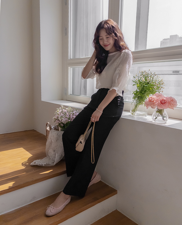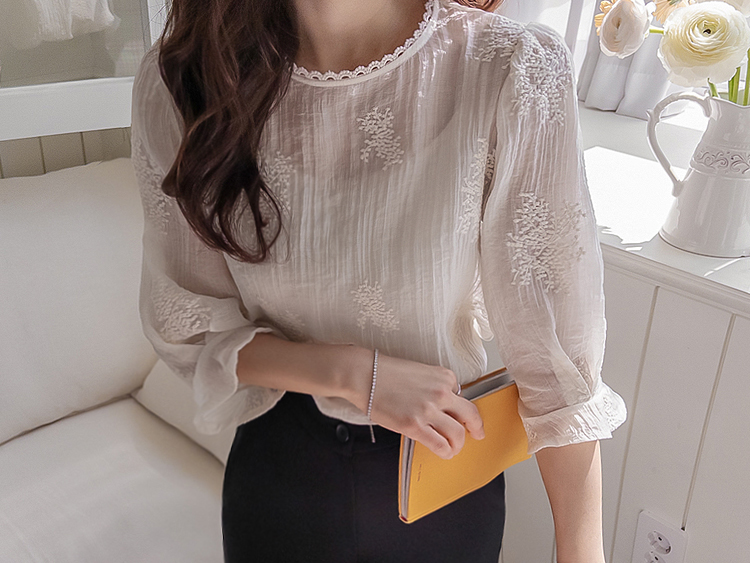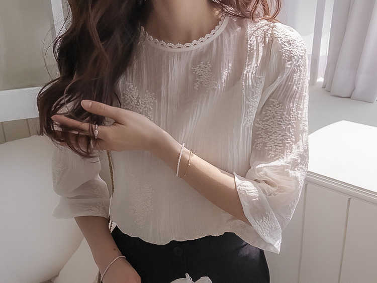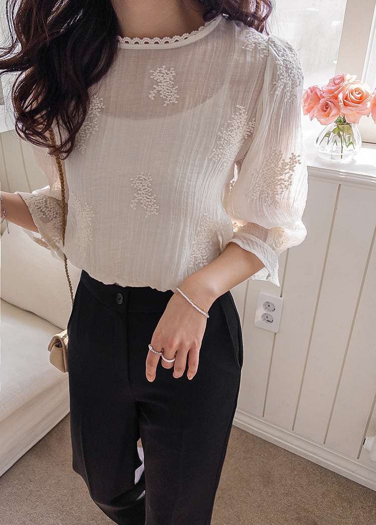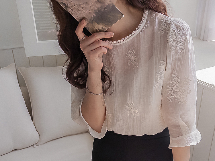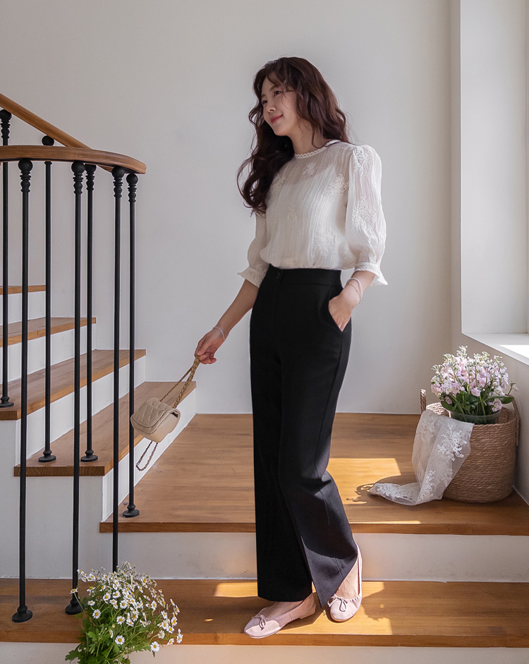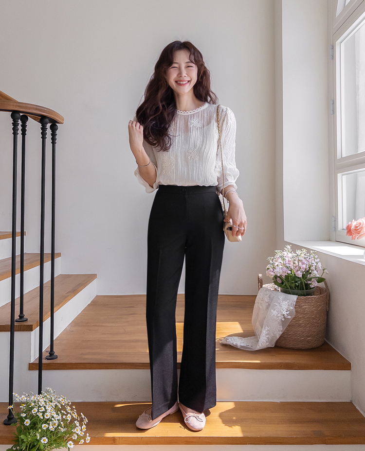 내추럴한 감성이 물씬 느껴지는 자수 블라우스 소개해드려요 :) 잔잔한 링클감이 느껴지는 코튼 원단에 은은하게 들어간 플라워 자수 디테일이 더해져 과하지 않으면서도 포인트가 되어주는 아이에요~ 가볍고 통기성 좋은 소재로 지금부터 한여름까지도 쭉 착용 가능하구요, 피부에 닿는 터치감도 부드러워 데일리로 즐기기 좋아요ㅎㅎ 넥라인에는 섬세한 레이스 마감이 더해져 얼굴선을 더욱 여리여리하게 만들어주고, 뒷부분 버튼 클로징으로 간편한 탈착까지 도와드려요! 소매는 살짝 퍼지는 봉긋한 핏으로 팔라인을 자연스럽게 커버해주면서 여성스러운 실루엣을 완성해준답니다♡ 과하지 않은 디테일과 고급스러운 무드로 매 시즌 꺼내입기 좋은 블라우스라 꼬~옥 소장 추천드릴게요*.*♡