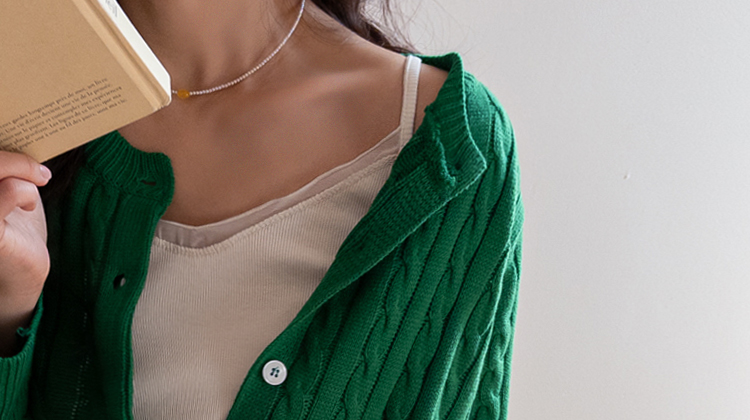 여리여리한 분위기를 살려주는 끈 나시탑 소개드려요 ^^ 전체적으로 슬림하게 떨어지는 핏에 신축성 있는 골지 원단으로 제작되어 몸에 부드럽게 감기듯 착용되는 아이템이에요. 넥라인은 은은한 V넥 디자인으로 답답하지 않으면서도 목선을 더욱 길어 보이게 연출해주고요, 앞라인을 따라 쉬폰 원단 디테일이 더해져 살짝 비치는 느낌이 부드럽고 여성스러운 분위기를 한층 더 살려줍니다. 가디건이나 니트 안 이너로 매치했을 때 넥라인 디테일이 자연스럽게 드러나 레이어드 아이템으로도 활용도가 높은 나시탑이에요 ♥