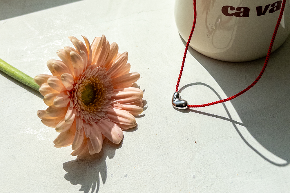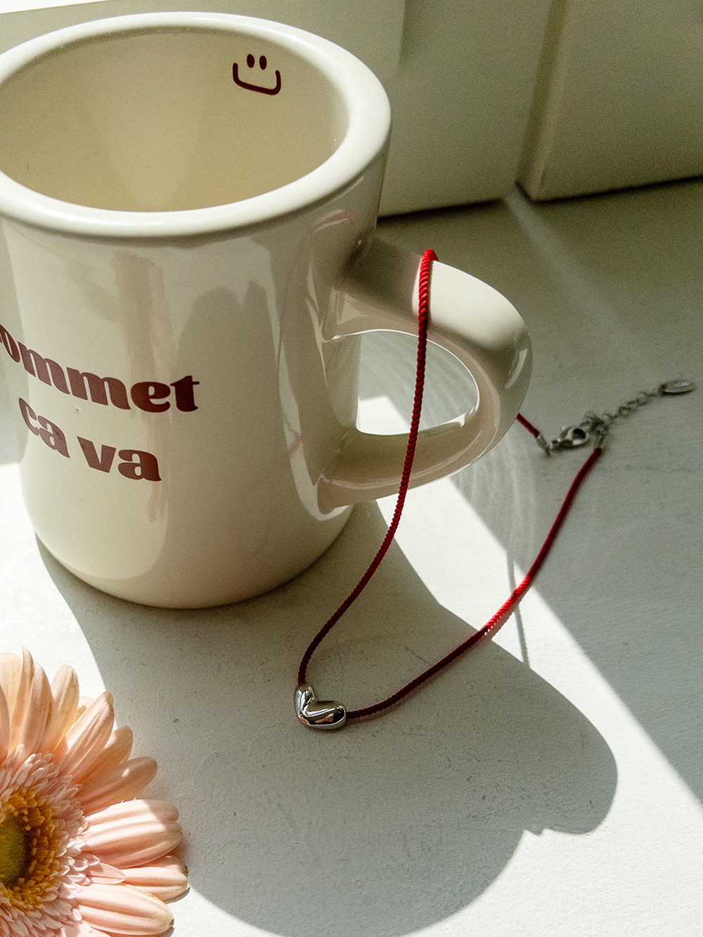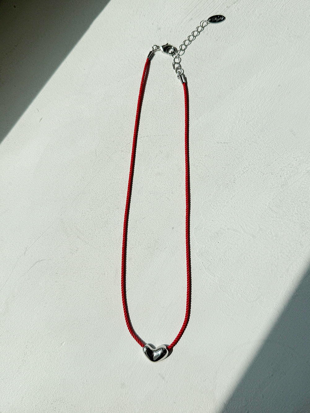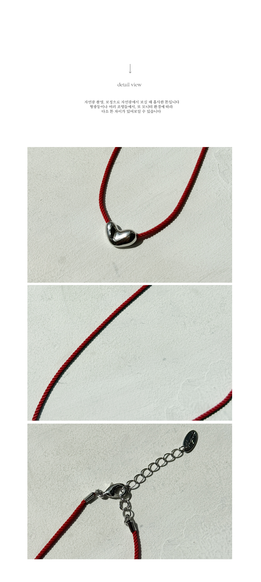 감각적인 컬러감으로 포인트 주기 좋은 레드 코드 네크리스 소개드려요 :) 선명한 레드 컬러의 끈은 단순한 실이 아닌 촘촘하게 꼬인 코드 형태로 은은한 결감과 텍스처가 살아있어 가볍지 않고 한층 더 완성도 있게 느껴져요. 중앙에는 매끈하게 폴리싱된 하트 쉐입의 신주 팬던트가 더해져 빛을 받으면 은은하게 반사되며 작지만 확실한 포인트가 되어줘요. 둥글게 볼륨감 있는 형태로 사랑스럽고 세련된 분위기를 동시에 담았어요. 길이 조절이 가능한 체인 디테일로 원하는 핏에 맞게 착용 가능하며, 단독으로도 충분히 포인트가 되지만 다른 목걸이와 레이어드해도 멋스럽게 연출돼요. 심플한 룩에 컬러 포인트를 더하고 싶을 때, 가볍게 스타일에 생기를 더해줄 아이템으로 추천드릴게요 ♥