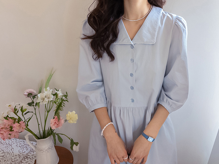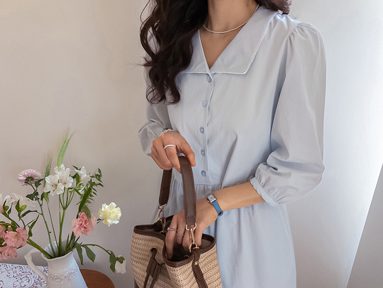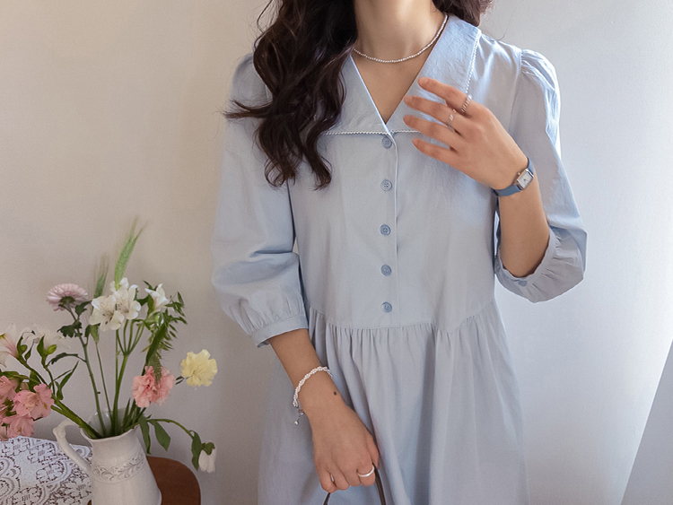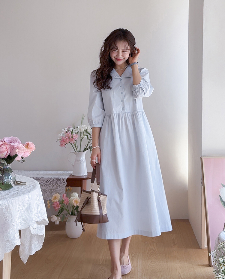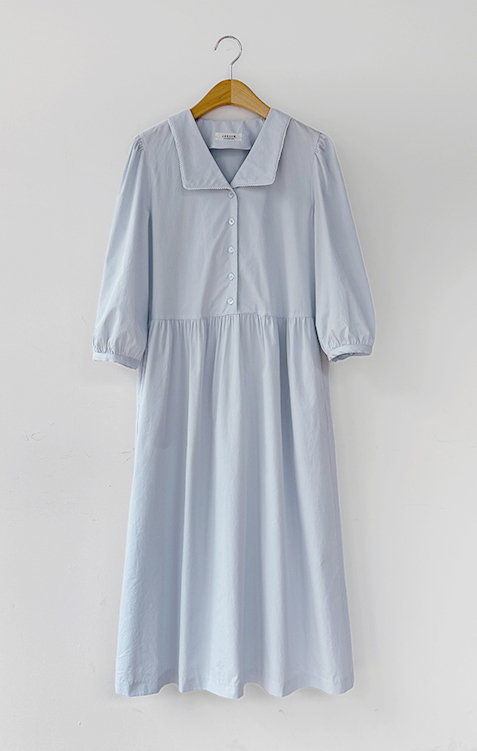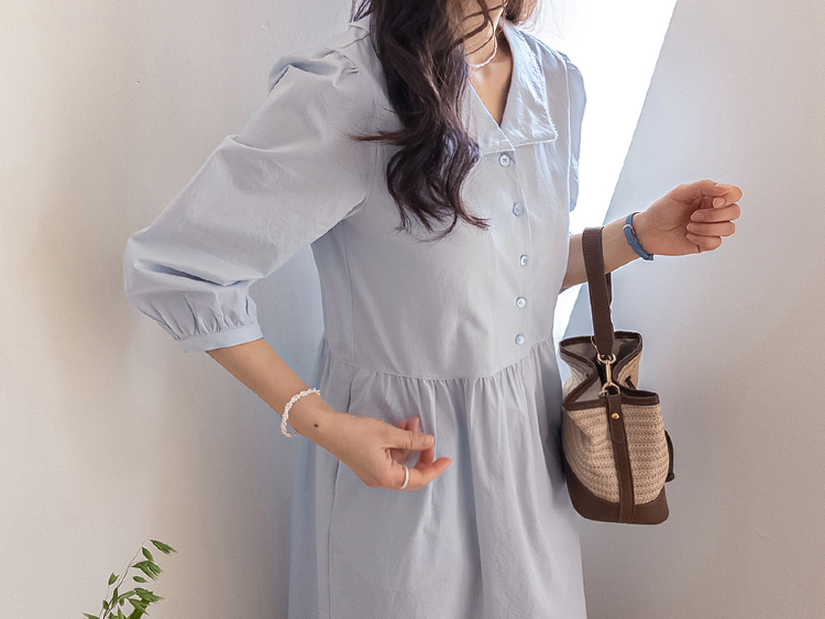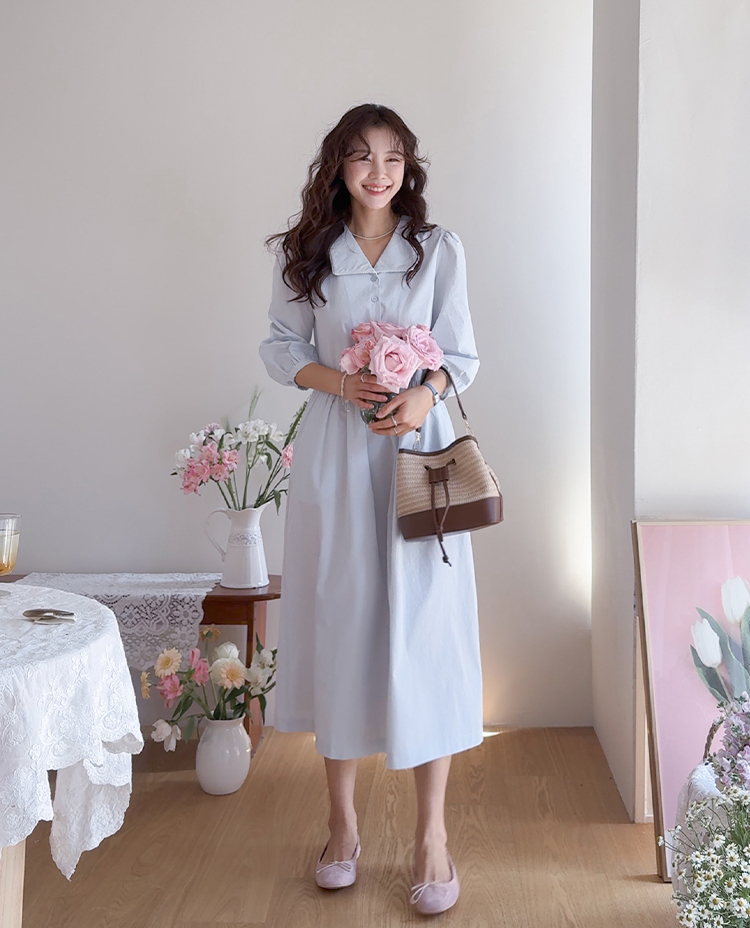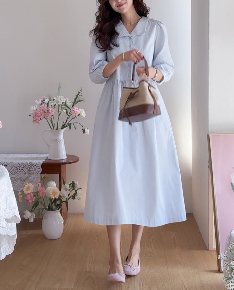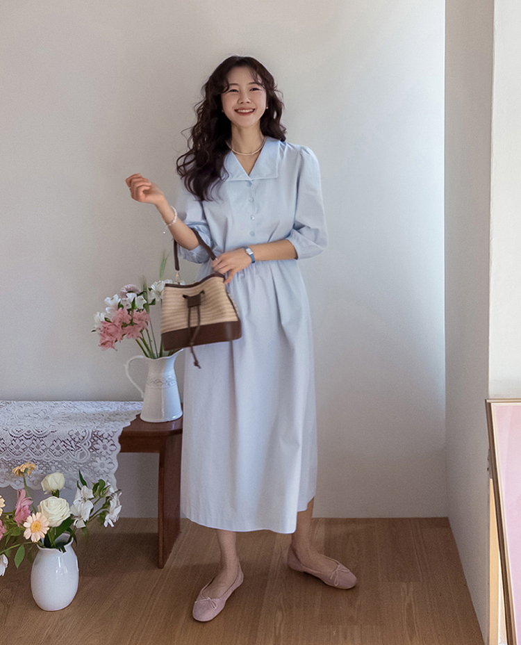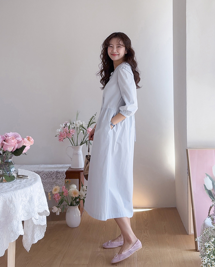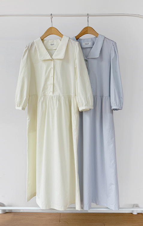단정하면서도 포인트가 살아있는 카라 원피스 소개드려요 :) 넥라인은 일반 셔츠 카라가 아닌 앞쪽으로 넓게 펼쳐지는 스퀘어 형태의 세일러 카라 디자인으로 어깨선을 따라 자연스럽게 퍼지며 쇄골 라인을 여리하게 강조해줘요. 카라 끝 라인은 부드럽게 각이 잡혀 있어 단정하면서도 은은한 포인트가 되는 디테일이에요. 앞 중심은 버튼 여밈으로 깔끔하게 떨어지며 허리선 아래로는 셔링을 잡아 부드럽게 퍼지는 A라인 훌 실루엣을 완성해줘요. 입었을 때 과하지 않으면서 자연스럽게 퍼지는 핏이 정말 예쁜 디자인이에요. 소매는 7부 퍼프 소매로 어깨에는 은은한 셔링, 소매 끝은 밴딩으로 잡아 볼륨감 있으면서도 편안하게 착용 가능해요. 뒤쪽에는 허리 스트랩이 더해져 체형에 맞게 묶어주면 실루엣을 더욱 정리해주고, 단정한 데일리룩부터 모임룩까지 다양하게 활용하기 좋은 원피스로 추천드릴게요 ♥
