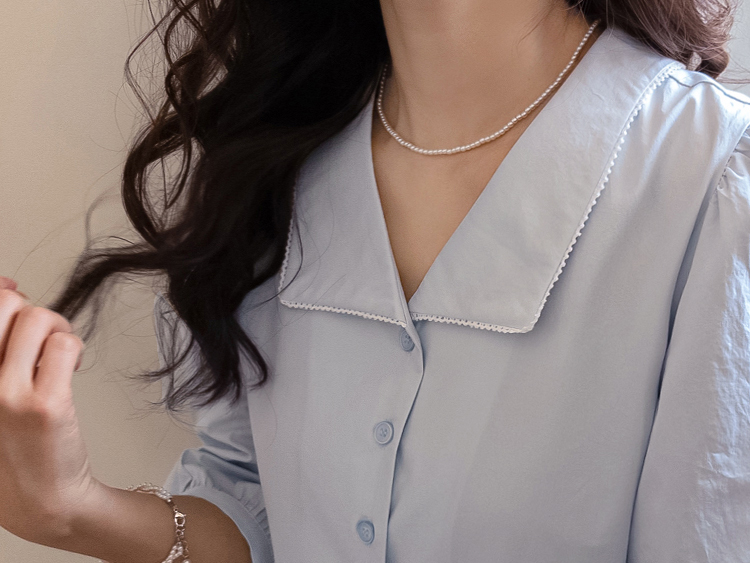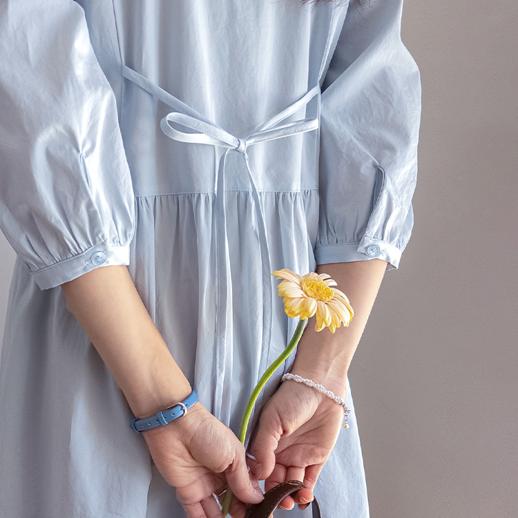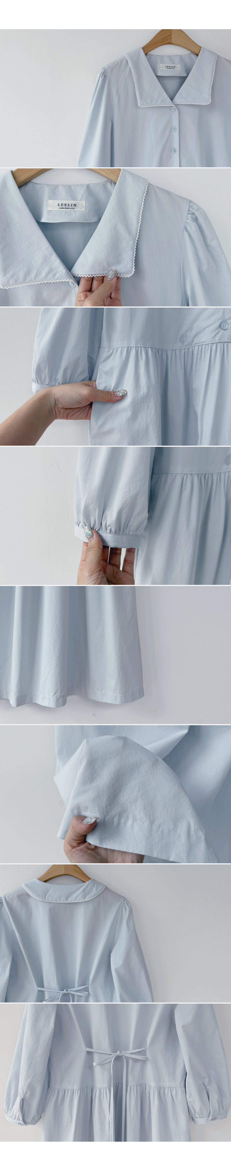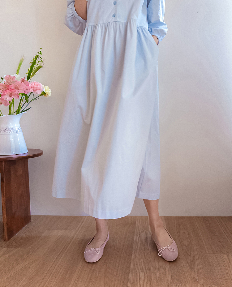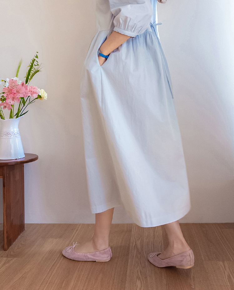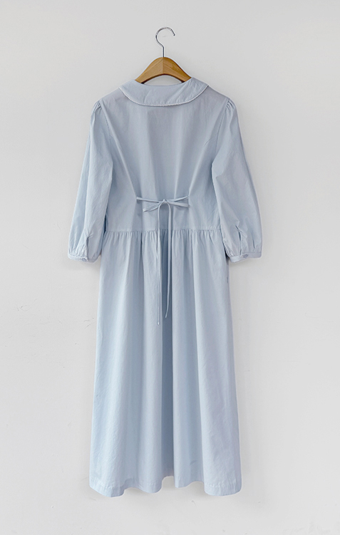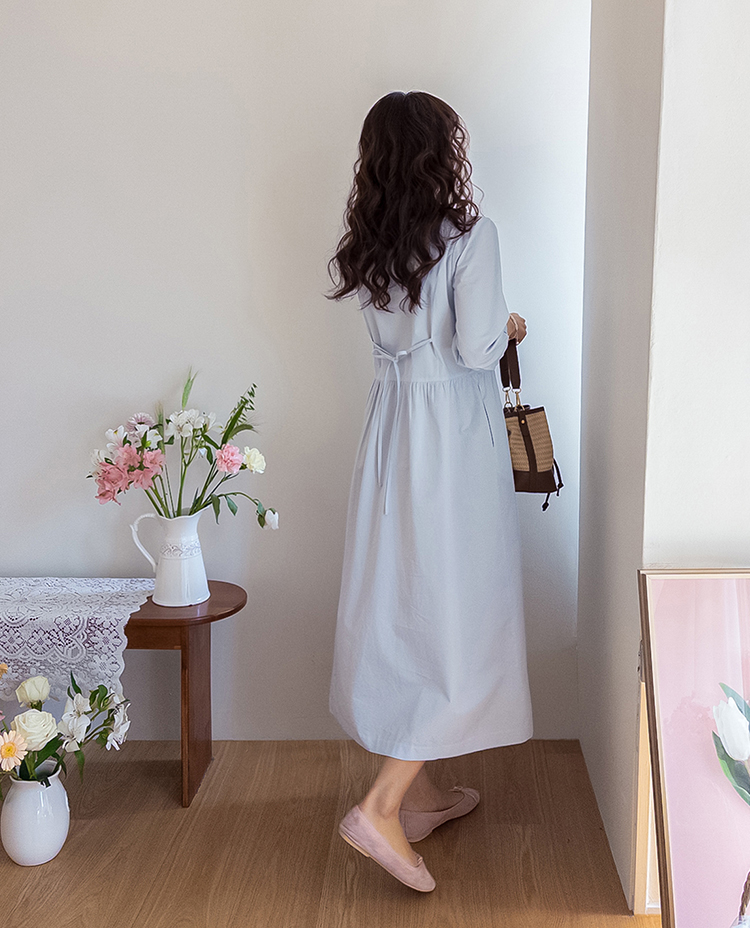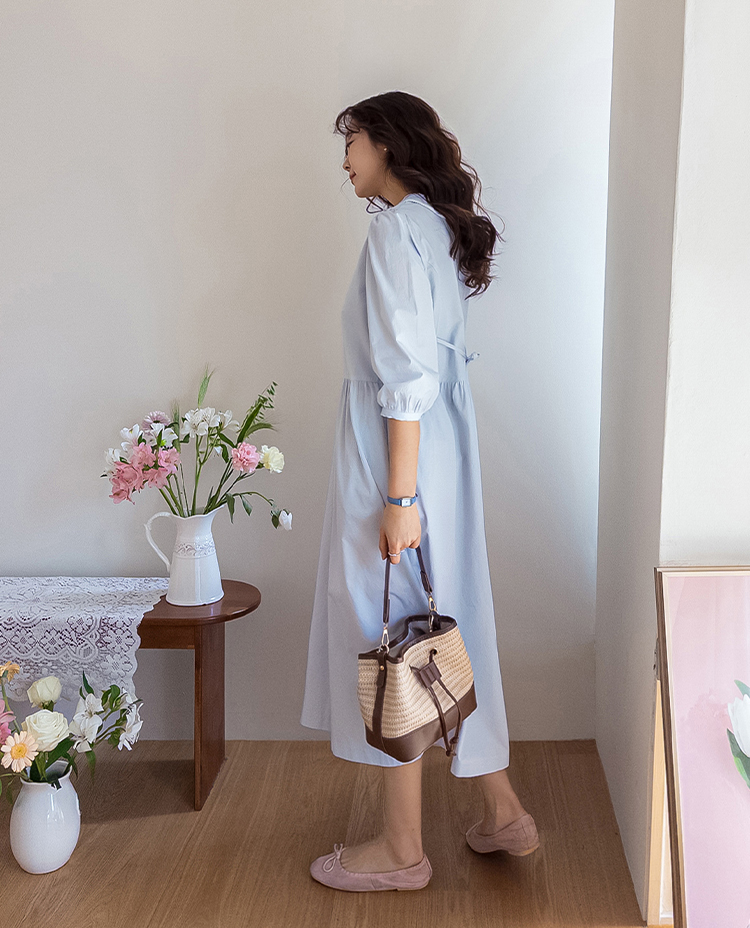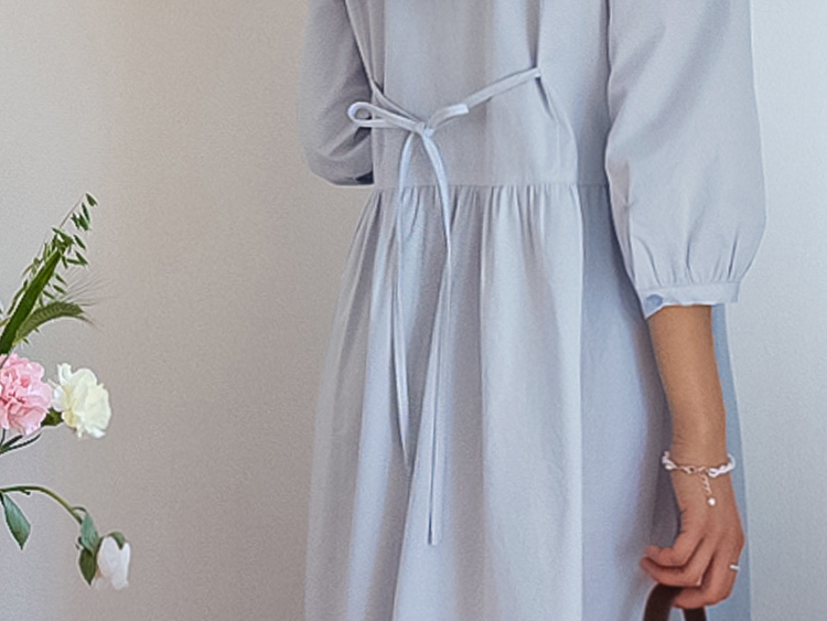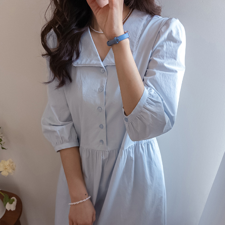 단정하면서도 포인트가 살아있는 카라 원피스 소개드려요 :) 넥라인은 일반 셔츠 카라가 아닌 앞쪽으로 넓게 펼쳐지는 스퀘어 형태의 세일러 카라 디자인으로 어깨선을 따라 자연스럽게 퍼지며 쇄골 라인을 여리하게 강조해줘요. 카라 끝 라인은 부드럽게 각이 잡혀 있어 단정하면서도 은은한 포인트가 되는 디테일이에요. 앞 중심은 버튼 여밈으로 깔끔하게 떨어지며 허리선 아래로는 셔링을 잡아 부드럽게 퍼지는 A라인 훌 실루엣을 완성해줘요. 입었을 때 과하지 않으면서 자연스럽게 퍼지는 핏이 정말 예쁜 디자인이에요. 소매는 7부 퍼프 소매로 어깨에는 은은한 셔링, 소매 끝은 밴딩으로 잡아 볼륨감 있으면서도 편안하게 착용 가능해요. 뒤쪽에는 허리 스트랩이 더해져 체형에 맞게 묶어주면 실루엣을 더욱 정리해주고, 단정한 데일리룩부터 모임룩까지 다양하게 활용하기 좋은 원피스로 추천드릴게요 ♥