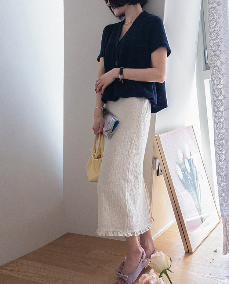 심플한 듯 디테일이 살아있는 H라인 롱 스커트예요 :) 전체적으로 과하지 않은 은은한 링클 텍스처 원단으로 밋밋하지 않고 자연스러운 입체감이 느껴지며, 가볍고 드라이한 터치감으로 여름까지 쾌적하게 착용하기 좋아요. 실루엣은 바디를 따라 슬림하게 떨어지는 H라인으로 단정하면서도 길어 보이는 핏을 만들어주고요, 밑단에는 잔잔한 프릴 디테일이 더해져 과하지 않게 여성스러운 무드를 살려주면서 걸을 때마다 은은하게 흔들리는 라인이 예쁘게 연출됩니다. 또한 뒷부분에는 트임 디테일이 있어 활동성을 높여주면서 답답함 없이 착용 가능해요. 기본 티셔츠, 니트, 블라우스 어디에나 잘 어울려 데일리부터 나들이룩까지 활용하기 좋은 깔끔한 스커트로 추천드릴게요 ♥
