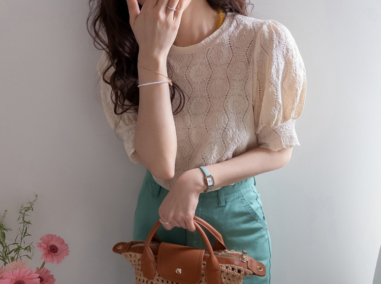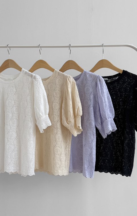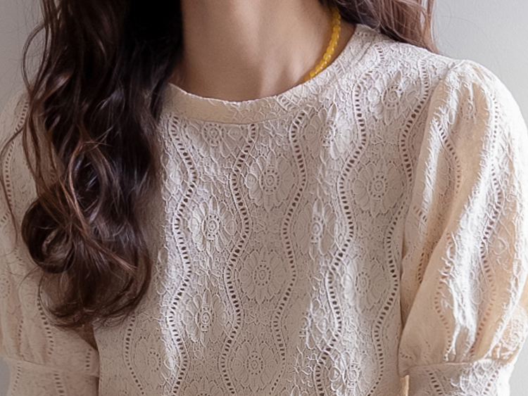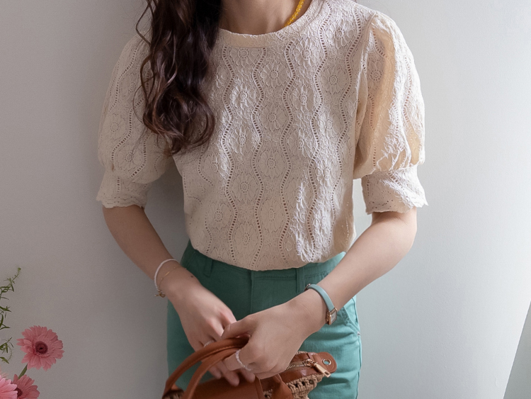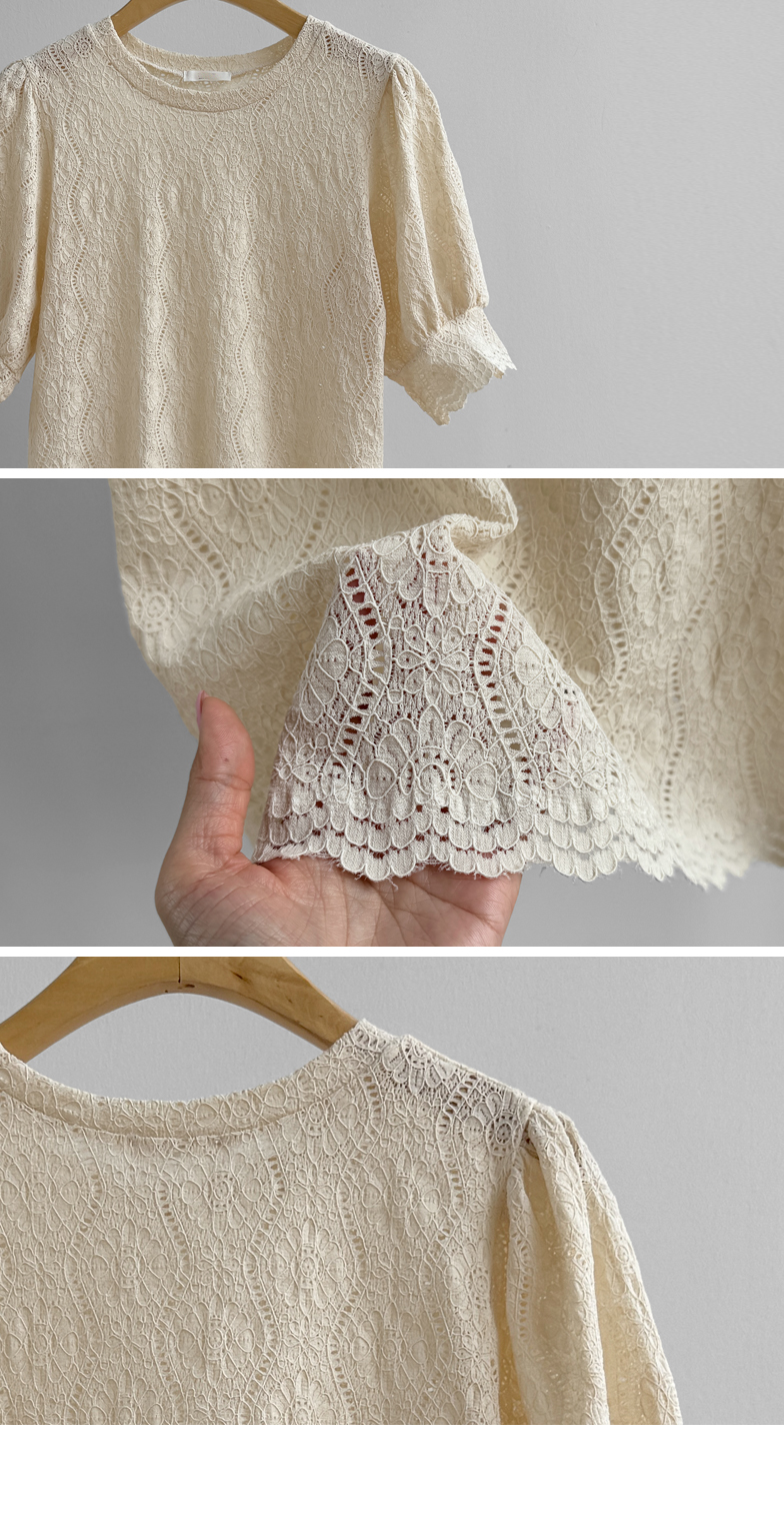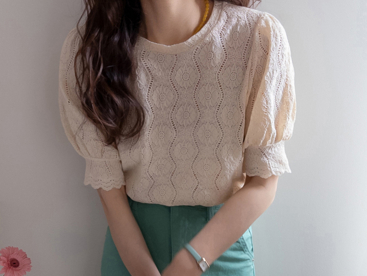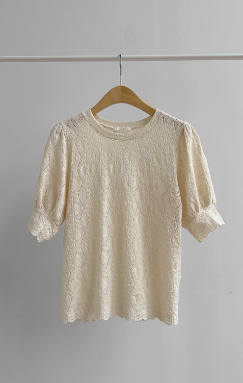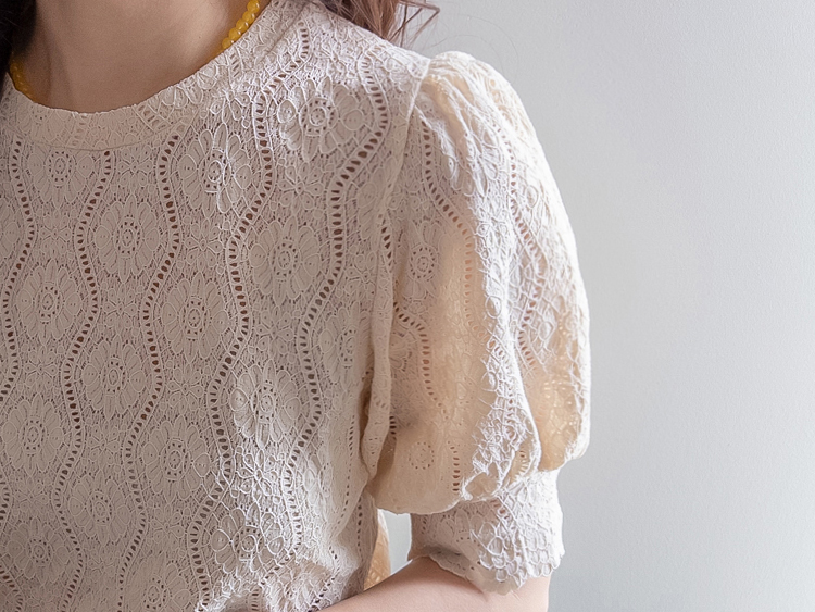 [Feminine blouse-like mood created with lace fabric*.*] [Three-dimensional texture highlighting a subtle pattern] [Lovely silhouette with voluminous puff sleeves] [An item as comfortable as a T-shirt and as pretty as a blouse]