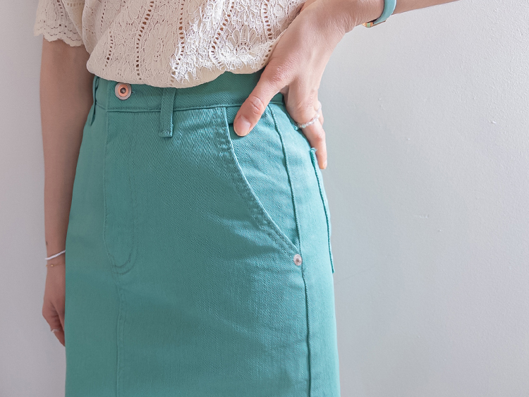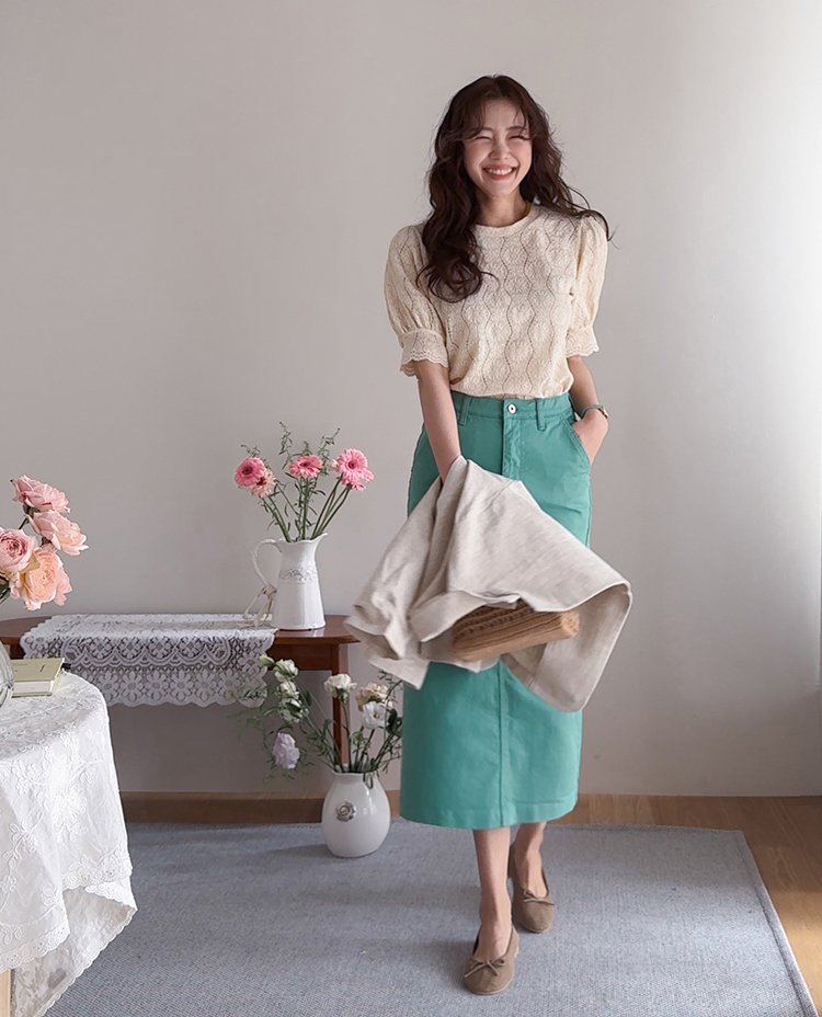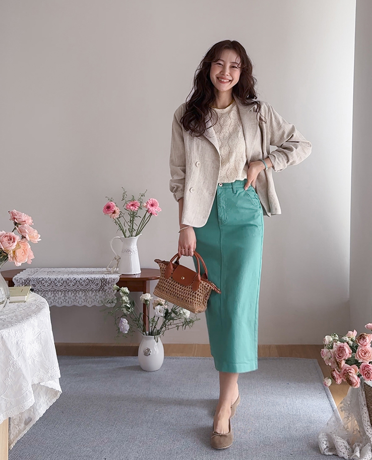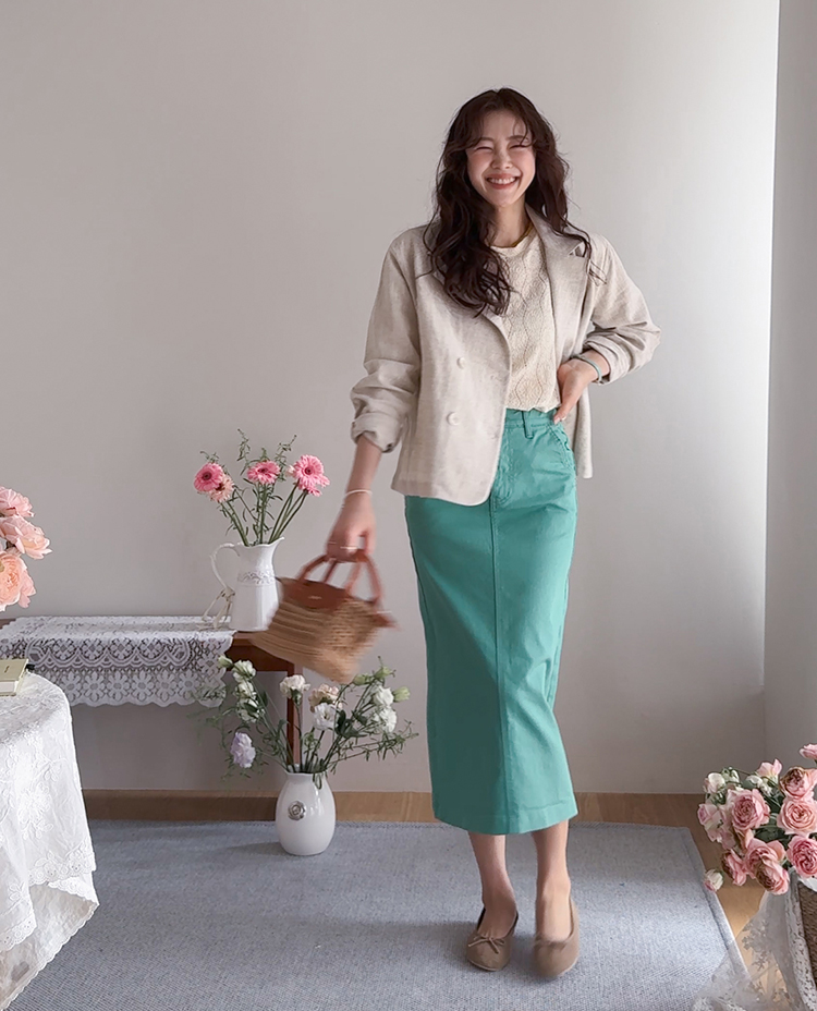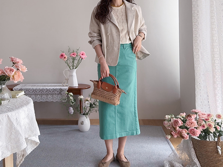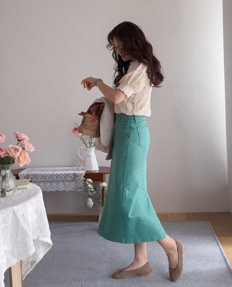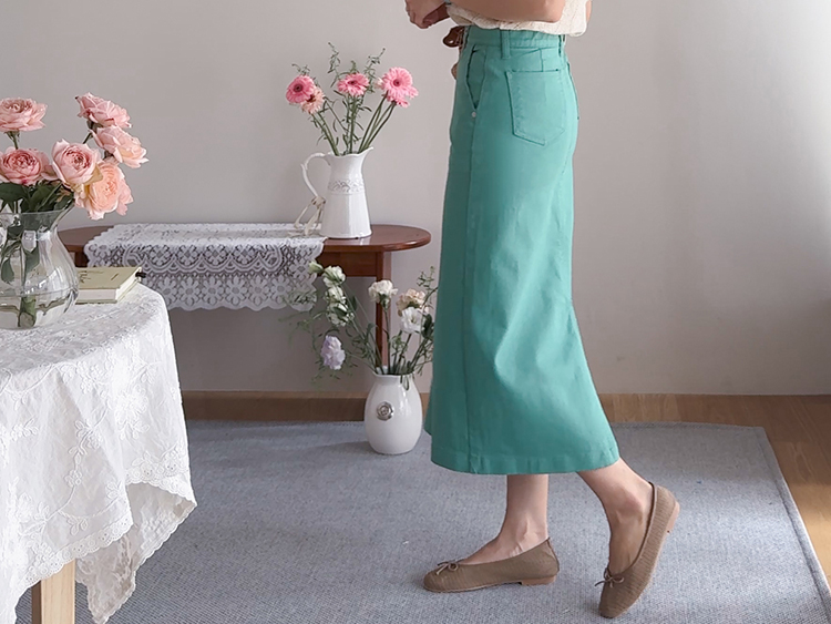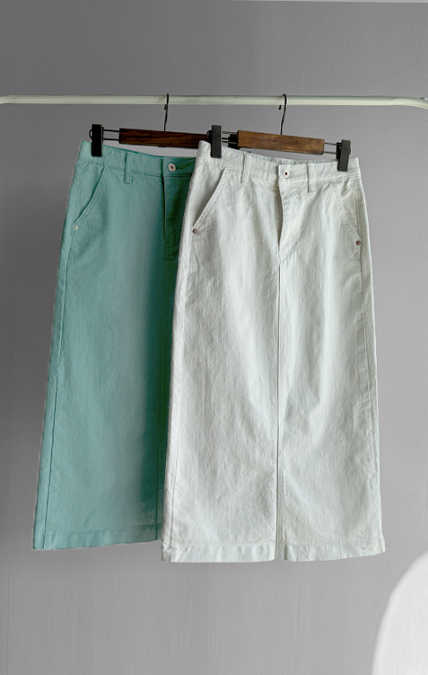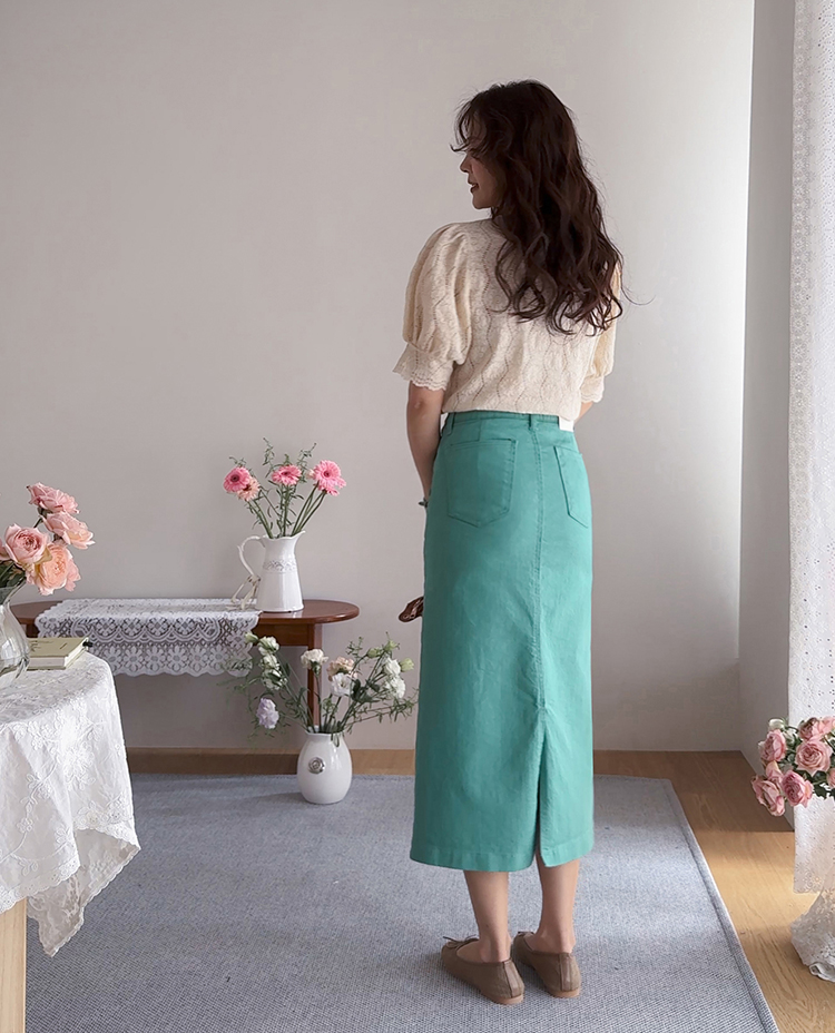 [Clean H-line silhouette*.*] [Back slit detail for comfortable movement] [Added spandex for a comfortable fit] [Daily skirt featuring fresh colors]